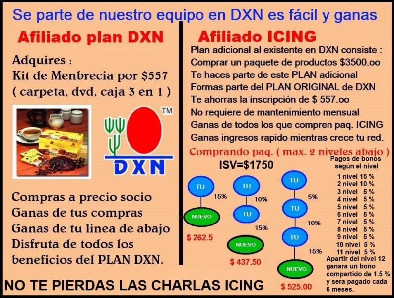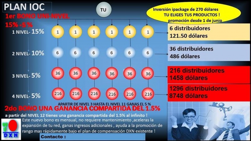 A) Introducción 1. Es la cubierta / decoración sobre el pastel existente, el cual es un plan de compensación adicional (uni-nivel) al Plan de Compensación DXN existente. 2. Los miembros pueden comprar un iPackage para poder participar en el plan IOC. 3. El iPackage es accesible para la mayoría de los miembros. B) Objetivo 1. Para activar a los miembros existentes que no están activos. 2. Para incrementar el reclutamiento de nuevos distribuidores. 3. Para ser competente en el mercado. 4. Para crear nuevas emociones. 5. Para permitir a los miembros ganar ingresos exponenciales de este plan IOC. 6. Para usar, compartir y vender los productos DXN. ![]() C) Características y Ventajas 1. La membresía puede ser heredada. 2. El Plan IOC permite a los miembros comprar cualquier mezcla de productos a precio Distribuidor. 3. La compra adicional de unidades de iPackage está permitido para crear nuevas líneas y colocarlos hasta el segundo nivel. 4. Ganar ingresos exponenciales. 5. No hay pérdidas de puntos SV (en la forma de iSV) 6. Ayuda a incrementar el reclutamiento y los bonos bajo el plan de compensación DXN existente. 7. Ayudar a la promoción de rango más rápidamente bajo el Plan de Compensación DXN existente. 8. Es un paquete internacional. 9. No se requiere igualar o emparejamiento de líneas. 10. No se requiere mantenimiento. 11. Stock semilla para ventas. 12. Reconocimiento de los PV para la promoción del Rango de Agente Estrella (SA). 13. Compresión Dinámica en base mensual. 14. Compra de única vez y ganar para siempre. 15. DXN es una Compañía muy estable. 16. La Jerarquía actual del Plan de Compensación DXN permanece. 17. Acelerar la expansión de la red. D) Definición de Términos Code : Número de Distribuidor del Plan de Compensación DXN existente (9 dígitos). Upcode : Número del Distribuidor del Patrocinador en el Plan de Compensación DXN existente (9 dígitos) iPackage : Es un paquete que el miembro necesita comprar para unirse al plan IOC. iSV : El SV asociado al valor de cada iPackage. iMember : Un Miembro de DXN sea nuevo o Existente que haya comprado el iPackage. iCertificate : Certificado otorgado a los miembros que compran el iPackage. iCode : El Código de los miembros en el plan IOC (13 dígitos: 9 dígitos del número del distribuidor + 2 dígitos del paquete + 2 dígitos en serie consecutivo) iUpcode : Código del Patrocinador en el plan IOC (13 dígitos: 9 dígitos del número del distribuidor + 2 dígitos del paquete + 2 dígitos en serie consecutivo) E) Como funciona el IOC 1. El Plan Icing On the Cake (IOC) está abierto a todos los miembros de DXN que compren al menos una unidad del iPackage. 2. Cada iPackage está disponible a Precio de Distribuidor (DP) $ 3,500.00 MXP y con un iSV de 1,750. 3. Cada miembro necesita llenar su Carta de Intención para comprar el iPackage (por favor refiérase al formato adjunto). 4. La compra bajo este plan IOC es opcional. 5. El iPackage puede ser comprado en el país de origen (de acuerdo a la dirección registrada en el Sistema DXN) 6. La compra de cualquier cantidad unidades es válida únicamente realizando el pago en una sola exhibición. 7. El iMember puede redimir los productos basados en el precio del valor del iPakage (por favor refiérase a la redención del producto en iPackage como aparece más adelante) 8. Cualquier redención de productos DXN en este proyecto, los respectivos PV del producto serán considerados para la promoción del rango (hasta alcanzar el rango de Agente Estrella, pero NO serán considerados los PV para cualquier calificación mensual, derecho a bonos mensual, Incentivo de Viaje e Incentivo de Teléfono Celular de acuerdo a las condiciones del Plan de Compensación DXN existente). 9. Por lo tanto no habrá puntos SV reconocidos para cualquier derecho a bonos bajo el plan de Compensación DXN Existente 10. Un distribuidor podrá comprar cualquier número de unidades para crear nuevas líneas (máximo hasta el segundo (2do) nivel) bajo sus propios iCodes. Del 3er nivel en adelante, deberán ser nuevos miembros reales. 11. Si un miembro opta por comprar más de una unidad del iPackage, todas las unidades deberán ser compradas bajo la misma jerarquía. 12. El iUpCode deberá ser definido si el miembro desea colocar bajo de sus unidades adicionales de iPackage o Nuevos iMembers bajo cualquiera de sus propios iCodes específicos diferentes a su primer iCode. Cualquier línea inferior en el IOC bajo el Segundo iCode deberá ser un iMember Nuevo en ese mes en particular (antes de que se procese el bono “icing”) que se haya unido como miembro de DXN después de la implementación del IOC. Los miembros existentes que se hayan unido antes de la implementación del IOC únicamente pueden ser colocados bajo el 1er iCode. 13. No se permitirá ningún cambio de patrocinador en el IOC. Por lo tanto si hubiera algún cambio en el plan de compensación DXN existente (con aprobación), sería el mismo efectuado en el IOC. 14. No está permitido el patrocinio de líneas cruzadas. La jerarquía del Plan de Compensación DXN existente será la usada para la jerarquía en el IOC. 15. Si un miembro no sé uniera a este plan, los bonos IOC basados en el iSV serán pasados a esas líneas superiores que ya se hayan unido de acuerdo a la jerarquía comprimida. Si en una etapa posterior estos miembros se unen a este plan IOC, el obtendría los bonos de sus líneas nuevas que se han unido en su grupo después, a partir de ese momento en adelante. 16. El cálculo de bonos está ilustrado en el Plan de Remuneración del IOC. 17. DXN se reserva el derecho de cambiar los términos y condiciones del Plan IOC sin previo aviso ni consentimiento de los miembros. F) iPackage – Redención de Productos 1. Con la compra de una unidad de iPackage, el iMember tendrá derecho a redimir cualquier combinación de productos DXN con el mismo valor del Precio Distribuidor que el iPackage comprado, en Sucursales de 